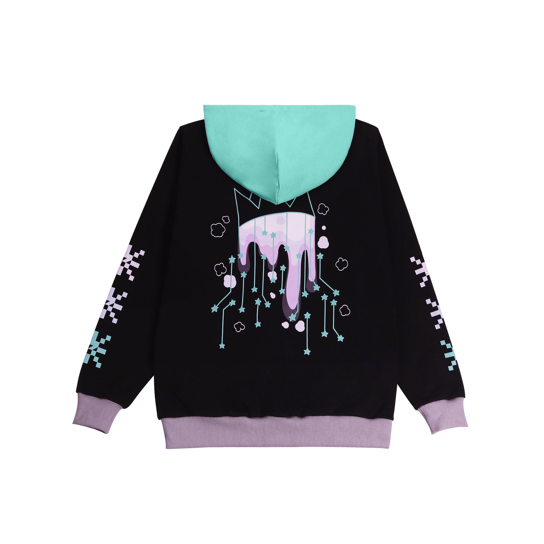 This colorblock hoodie is sure to catch attention. Featuring an aqua colorblock hood and pocket, with purple ribbed cuffs, this hoodie is a futuristic statement piece.